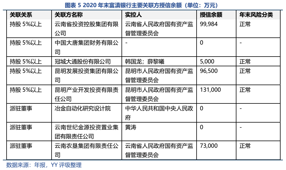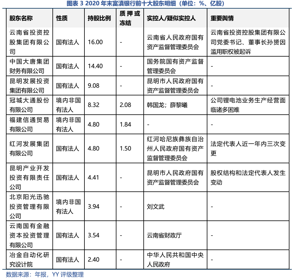 截至2020年末,富滇銀行前十大股東合計(jì)持股71.69%,其中國資持股比例達(dá)54.63%,國資背景濃厚。其中,云南省投資控股集團(tuán)有限公司通過與云南國有金融資本投資管理有限公司、云南能投聯(lián)合外經(jīng)股份有限公司(非前十大股東)構(gòu)成關(guān)聯(lián)關(guān)系,合計(jì)持有富滇銀行19.70%的股份,為富滇銀行的最大股東。值得關(guān)注的是該公司黨委書記、董事長孫赟今年5月因?yàn)E用職權(quán)被起訴。