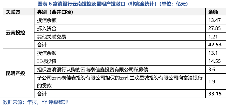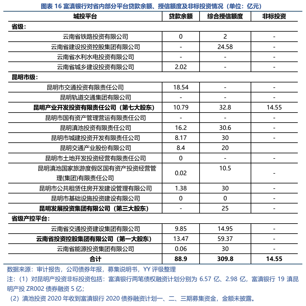 此外,通過對公司審計(jì)報(bào)告等資料的梳理,據(jù)不完全統(tǒng)計(jì),云南省及昆明市主要平臺(tái)共獲得富滇銀行的授信額度達(dá)309.8億元,貸款余額為88.9億元,其他小平臺(tái)可能零散也有些授信,區(qū)域整體來講要關(guān)注城投后續(xù)的再融資邊際。