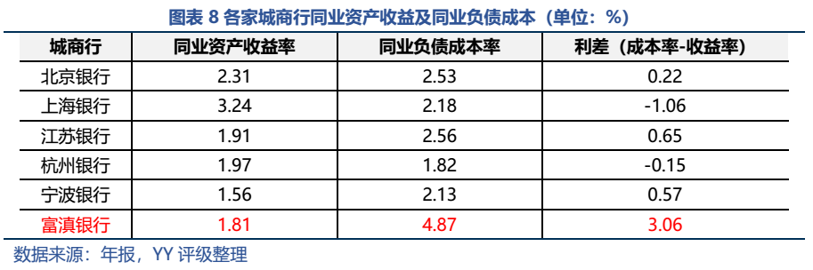 值得關(guān)注的是富滇銀行同業(yè)資產(chǎn)收益率與同業(yè)負(fù)債成本率之間嚴(yán)重不匹配。與幾家資質(zhì)較好的城商行相比,同業(yè)資產(chǎn)收益率偏低,但同業(yè)負(fù)債的成本率卻過高,二者利差高達(dá)3.06%。