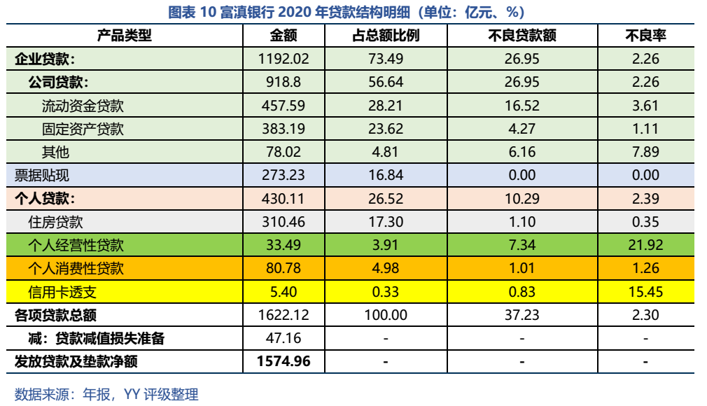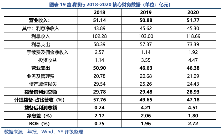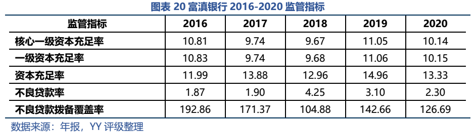 此外需要關(guān)注個(gè)人貸款業(yè)務(wù)。富滇銀行個(gè)人貸款以住房貸款及消費(fèi)貸款為主;經(jīng)營性貸款規(guī)模較小,但20年末其不良率高達(dá)21.92%。雖然就該類貸款性質(zhì)而言,本身就較易出現(xiàn)不良,但如此之高的不良率還是反映出云南地區(qū)較弱的營商環(huán)境以及銀行可能存在的個(gè)人業(yè)務(wù)管理漏洞、風(fēng)控不到位。