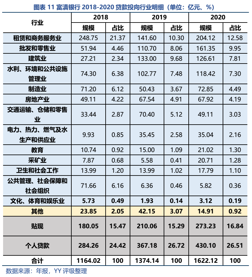 行業(yè)分布來看,近年來富滇銀行對第一大行業(yè)租賃和商務(wù)服務(wù)業(yè)的投放規(guī)模有所下降,加大了對批發(fā)零售(小微較多)、建筑水利電力(重點(diǎn)建設(shè)項(xiàng)目)等行業(yè)的投放,這與富滇銀行“加大小微企業(yè)及區(qū)域重點(diǎn)建設(shè)項(xiàng)目領(lǐng)域的信貸支持”策略相匹配。但是關(guān)注個(gè)人經(jīng)營性貸款高不良,未來小微要防范。