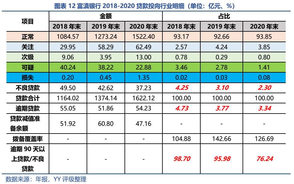 2020年末,富滇銀行對公貸款占比達(dá)73.49%。具體來看,流動(dòng)資金貸款占比較高,占總額的28.21%,隨著15號(hào)文的落實(shí)推進(jìn),預(yù)計(jì)富滇銀行流貸規(guī)模將有一定下滑,屆時(shí)通過與21年年報(bào)中相關(guān)信息的比較,或許可以在一定程度上對富滇銀行原有流貸流向當(dāng)?shù)仄脚_(tái)的大致規(guī)模和比例進(jìn)行模糊推測。