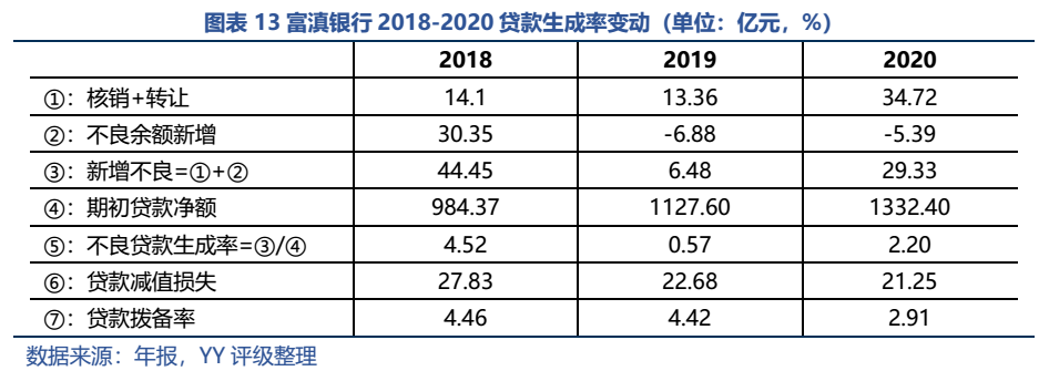 從動(dòng)態(tài)角度來分析富滇銀行的貸款質(zhì)量。受核銷及轉(zhuǎn)出不良貸款規(guī)模擴(kuò)大及有效控制新增不良的影響,2018-2020年富滇銀行不良貸款生成率整體呈下降趨勢。雖然減值準(zhǔn)備的收縮使得貸款撥備率有所下降,但以目前的減值準(zhǔn)備規(guī)模足以覆蓋當(dāng)年新增不良,至少從報(bào)表來看,富滇銀行的貸款質(zhì)量確有轉(zhuǎn)好的趨勢,但是考慮區(qū)域城投類的風(fēng)險(xiǎn)仍在,趨勢難言好轉(zhuǎn)。