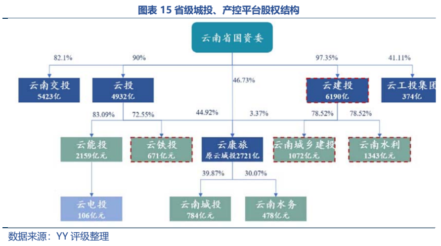從可搜集到的信息來看,富滇銀行對云南投控及昆明產(chǎn)投兩家省內(nèi)平臺(tái)股東敞口最大。不包含富滇銀行直接認(rèn)購其債券、非標(biāo)等金融資產(chǎn)的情況下,分別仍有42.53億元、33.15億元的關(guān)聯(lián)交易。而這兩家平臺(tái)雖然各自在省級(jí)及昆明市級(jí)處于較為重要的地位,但云南投控持股多家省級(jí)平臺(tái),牽一發(fā)而動(dòng)全身;昆明產(chǎn)投也因昆明市較多的平臺(tái)數(shù)量而難以保證獲得資源的充足程度。對于富滇銀行的跟蹤,繞不開的是區(qū)域內(nèi)的平臺(tái),后文將進(jìn)一步揭露二者之間的緊密聯(lián)系。