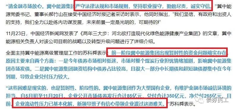 此前的2020年11月23日,冀中能源首次公開(kāi)發(fā)聲回應(yīng)公司債務(wù)問(wèn)題,明確“企業(yè)流動(dòng)性壓力已基本化解,新領(lǐng)導(dǎo)班子有信心帶領(lǐng)企業(yè)渡過(guò)這道難關(guān),請(qǐng)金融市場(chǎng)放心!”