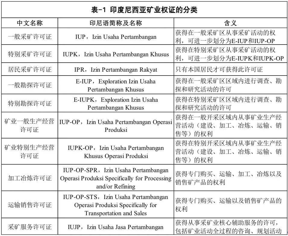 依據印尼《礦產和煤炭礦業法》及相關規定,印尼相關的礦業權證由能礦部(MEMR)頒發。印尼礦業權證的分類是按照礦產資源的開發順序(調查、勘探、可行性研究、礦區建設、開采、加工冶煉、運輸銷售等階段)進行的,因此種類較多,且彼此之間的適用范圍存在一定程度的重疊,可能會導致外國投資者對申請何種礦業權證并不十分清楚。印尼礦業權證主要可分為一般采礦許可證(IUP)、特殊采礦許可證(IUPK)和居民采礦許可證(IPR),其中IPR只有本國居民才可獲得。IUP和IUPK按照礦業開發活動的時序可分為E-IUP(一般勘探許可證)和E-IUPK(特別勘探許可證)、IUP-OP(礦業一般生產經營許可證)和IUPK-OP(礦業特別生產經營許可證)、IUP-OP-SPR(加工冶煉許可證)、IUP-OP-STS(運輸銷售許可證),以及IUJP(采礦服務許可證)和IPB(巖石開采許可)等,如表-1所示: