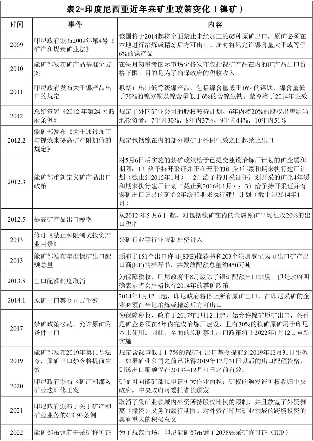 印尼政府對外國投資者投資鎳礦的限制主要集中在原礦出口和準入限制兩方面。2010年以前,印尼政府為了鼓勵礦產資源開發,促進經濟發展,并不完全限制鎳礦原礦出口。2010年以來,印尼逐漸收緊了包括鎳礦石在內的原礦出口政策,政府希望借助本國的資源稟賦優勢來吸引外國資本參與本國礦業相關產業鏈的工業基礎建設,從而擴大就業,增加稅收,把更多的產值留在國內,而不是僅僅出賣礦物原材料。因此,印尼有關包括鎳礦在內的原礦出口政策總體呈逐漸收緊的態勢:2012年5月,印尼政府開始逐步提高礦產品出口稅率;2014年1月,印尼實施全面禁止鎳礦原礦出口政策;2017年1月,印尼政府為了保障本國稅收,開始附條件允許原礦出口;2019年,印尼能礦部將原定于2022年1月重新實施的原礦出口禁令提前至2020年1月1日生效;2022年3月,印尼政府表示可能從今年開始對鎳產品加征出口稅(如表2)。