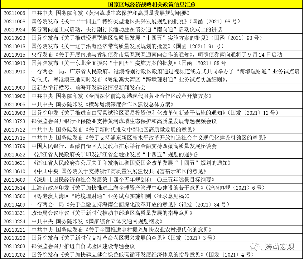 除大灣區的相關政策,其它經濟區域的政策亦可圈可點,如9月23日的資源型地區、9月18日的遼寧沿海經濟帶、9月13日的東北全面振興、9月3日的自貿區政策、7月22日的中部地區、7月15日的浦東新區、6月10日的浙江建設共同富裕示范區、、4月9日的金融支持海南、3月31日政治局會議審議的中部地區高質量發展、2月21日的鄉村振興以及2月2日的綠色低碳經濟等比較值得關注。