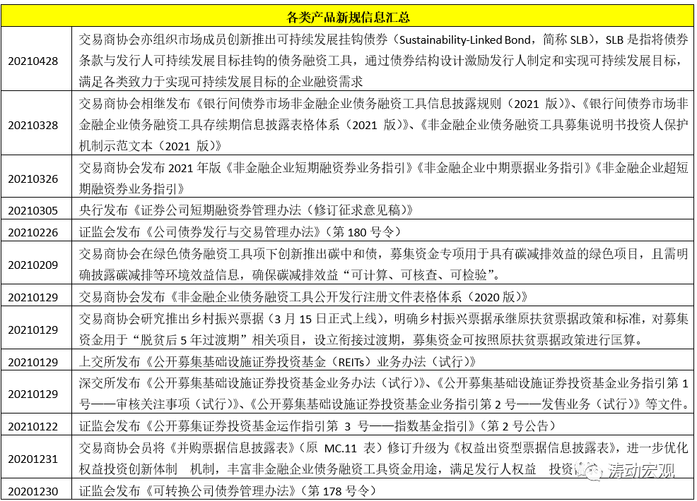 (1)2021年以來一系列產品新規亦陸續出臺,具體包括可轉債、權益出資型票據(原并購票據)、鄉村振興票據(繼承扶貧票據)、碳中和債、公司債、券商短融、指數基金、公募REIts等。