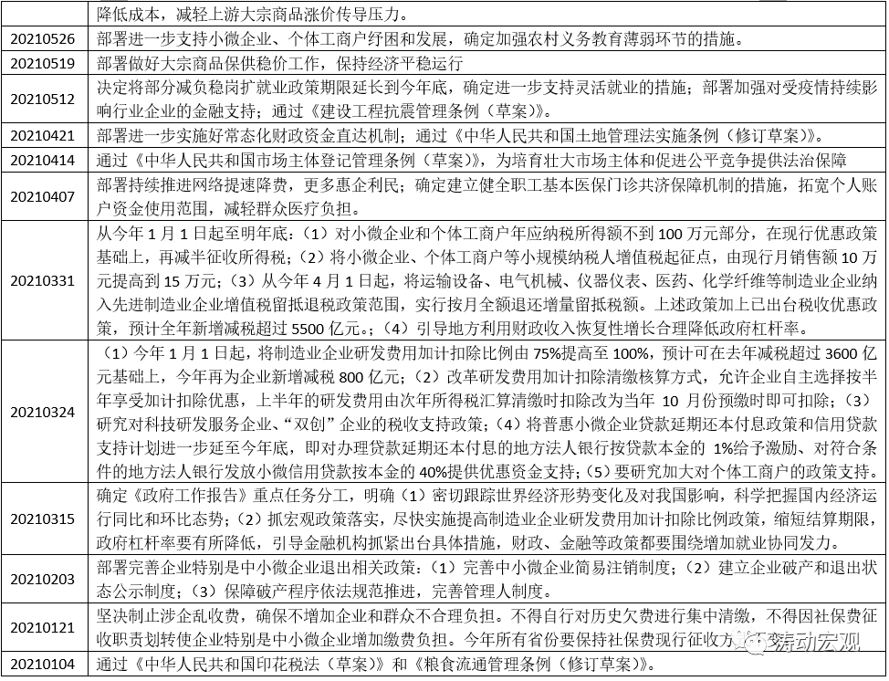 一月3-4次的國務院常務會議同樣也代表著政策層面的一些導向,具體看今年以來國務院常務會議的重點在于實施結構性減稅政策、將普惠小微企業貸款延期還本付息政策和信用貸款支持計劃進一步延至2021年底、通過財政收入恢復性增長來降低政府杠桿率(說明降低政府杠桿率主要是針對地方政府且主要是通過地方存量債務整頓來實現)、大宗商品價格等方面。