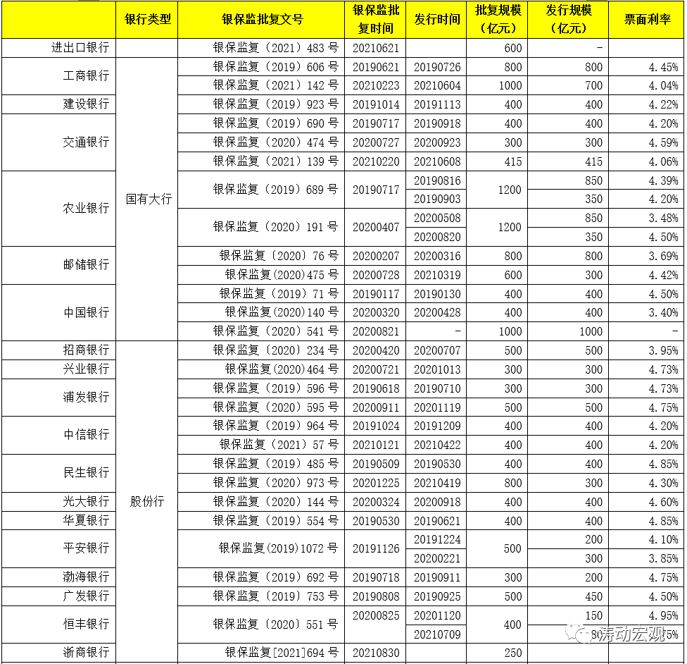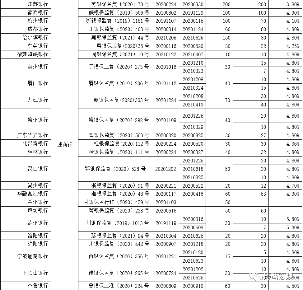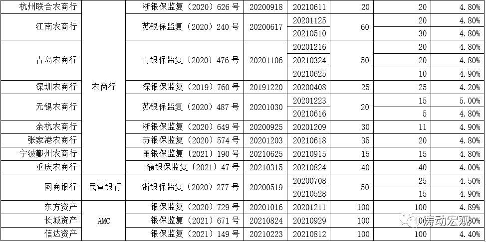 (2)80家機構的合計獲批發行規模為18520億元,進出口銀行600億元、全部國有大行8915億元、12家股份行6350億元、42家城商行2014.50億元、7家農商行295億元以及網商銀行50億元、3家金融AMC300億元。