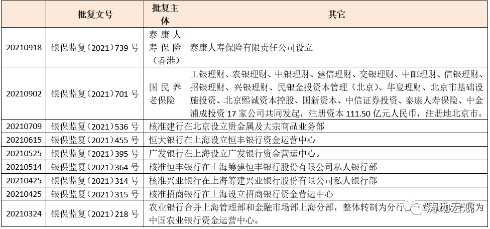 (1)2021年以來銀保監會新批籌了4家理財公司、2家私行專營機構與4家資金專營機構。這4家理財公司分別為渤銀理財(渤海銀行)、恒豐理財(恒豐理財)、施羅德交銀理財(合資)、高盛工銀理財(合資)。目前理財公司已獲批籌建28家(含4家合資),具體包括全部國有6大行、11家股份行(僅剩浙商銀行)、6家城商行和1家農商行。