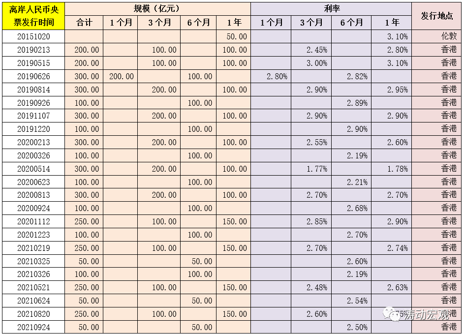 為推動離岸人民幣市場發展,帶動其他發行主體在離岸市場發行人民幣債券、完善離岸人民幣收益率曲線,央行于2018年11月在香港建立了離岸人民幣票據的常態發行機制(實際上最早于2015年10月便首在倫敦發行離岸央票),以相對穩定的頻率發行3個月、6個月、1年等期限品種的央行票據。