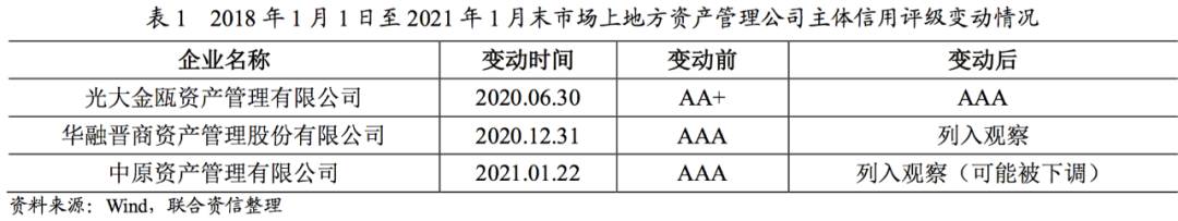 從行業(yè)信用級別調(diào)整情況來看,從2018年1月1日至2021年1月末,未有主體級別被下調(diào)的地方資產(chǎn)管理公司,有1家地方資產(chǎn)管理公司的主體級別從AA+被上調(diào)至AAA,系光大金甌資產(chǎn)管理有限公司,其主體評級被上調(diào)原因是該公司在集團戰(zhàn)略定位中有重要意義,且對資本金提升有明確的安排,預計未來公司資本實力將進一步增強。此外,華融晉商資產(chǎn)管理股份有限公司被列入評級觀察,主要系該公司所持有的資產(chǎn)涉及重大訴訟,未來涉訴資產(chǎn)對公司風險管理、流動性、盈利能力和短期償債壓力等多方面可能產(chǎn)生影響;中原資產(chǎn)管理有限公司被列入可能下調(diào)的觀察名單,原因是該公司外部融資環(huán)境有所惡化,且未來三個月債務規(guī)模較大,流動性趨于緊張,疊加企業(yè)自身盈利下滑,均對其信用狀況產(chǎn)生不利影響。