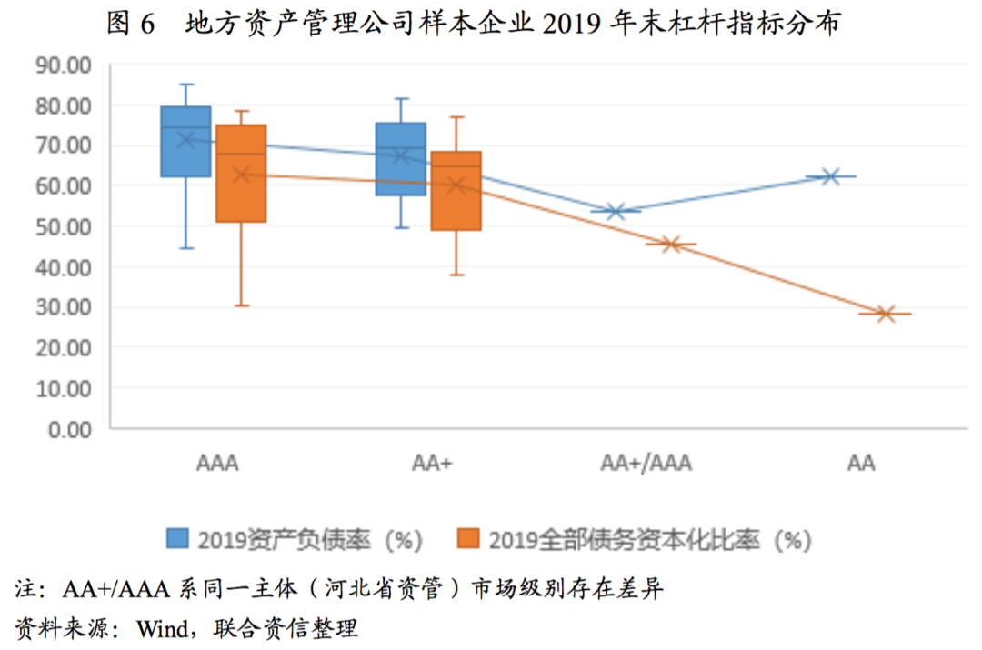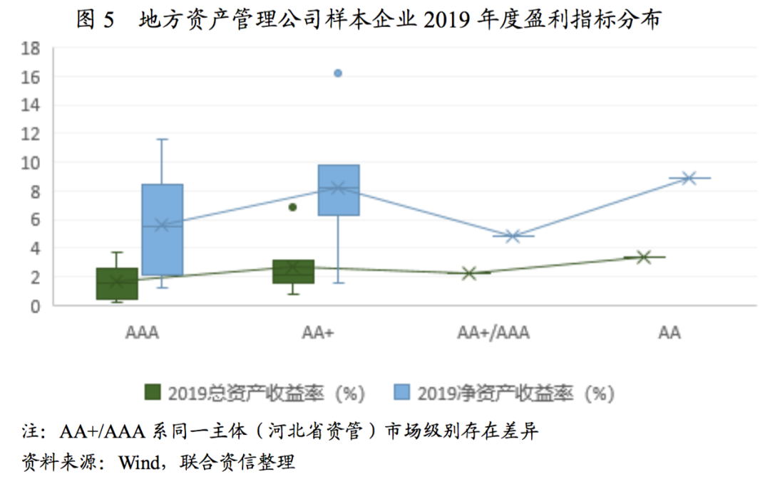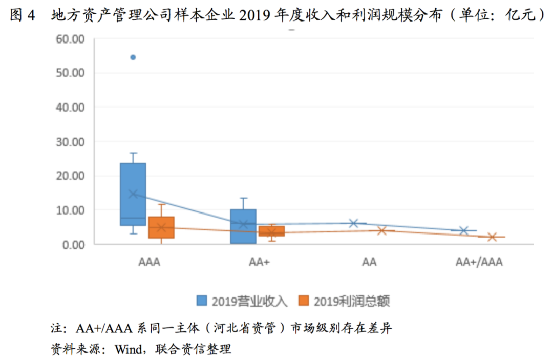從營業(yè)收入和利潤總額來看,2019年,地方資產(chǎn)管理公司中,AAA級別主體的營業(yè)收入和利潤總額最大值分別為54.55億元和11.61億元,AA+級別主體中有2家企業(yè)的營業(yè)收入和利潤總額在AAA序列中能排到靠前位置。AA級唯一主體的營業(yè)收入和利潤總額已達AA+收入和利潤水平。值得指出的是,地方資產(chǎn)管理公司對不良資產(chǎn)業(yè)務的收入確認方式存在差異,目前普遍有全額法和凈額法2種,導致收入指標差異可能較大,可比性不強,但利潤指標的可比性較好。
