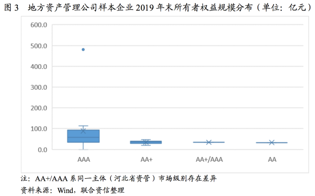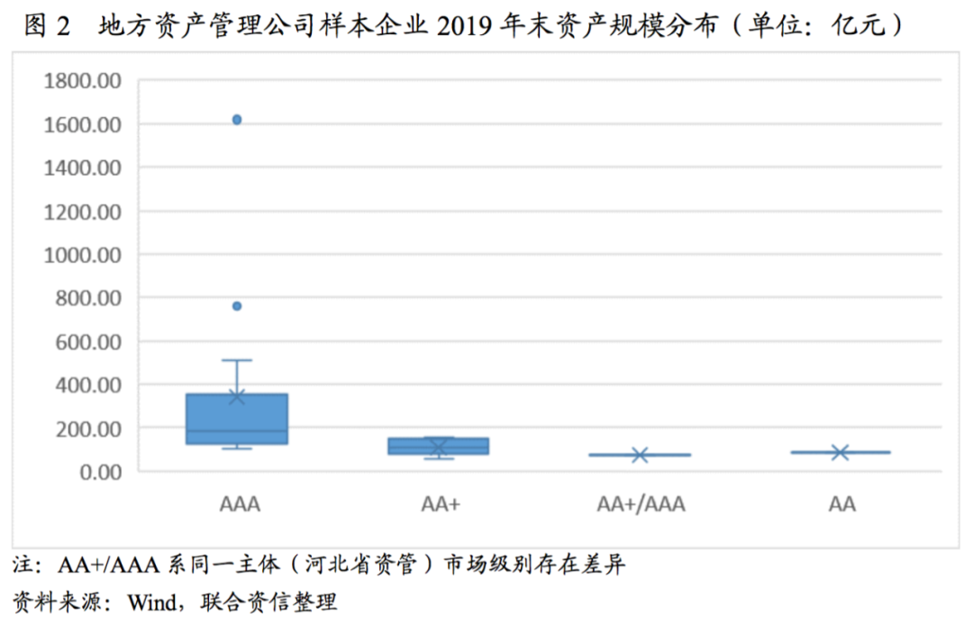 從樣本企業(yè)資產(chǎn)規(guī)模來看,截至2019年末,主體AAA級別資產(chǎn)規(guī)模最大值1619.19億元、最小值106.74億元、平均值379.69億元;AA+級別企業(yè)中,資產(chǎn)規(guī)模最大值154.39億元,最小值57.08億元;存在級別差異的河北省資管,其資產(chǎn)規(guī)模為74.21億元;AA級別僅有一家企業(yè),其資產(chǎn)規(guī)模為86.34億元,高于AA+級別最小值。