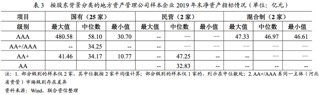 從樣本企業(yè)凈資產(chǎn)的區(qū)間分布來看,整體上存在一定程度的級別對應梯度關系,且同一級別中,國有背景企業(yè)的凈資產(chǎn)最小值顯著低于民營和混合制企業(yè),主要原因是目前市場上對地方資產(chǎn)管理公司評定級別的核心基礎邏輯是地方資產(chǎn)管理公司在化解地方不良資產(chǎn)、維護地方金融穩(wěn)定方面承擔著一定的社會責任,其所具有的政策性意味著地方資產(chǎn)管理公司在遭遇極端不利情況或債務危機時可能獲得政府的扶持和救助,而國有股權比例是政府扶持可能性的直接體現(xiàn)因素之一。