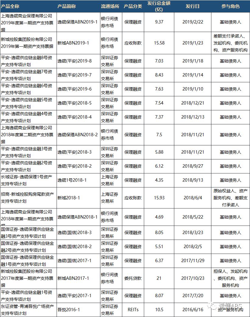 2019年2月22日,上海逸錕商業保理有限公司2019年度第一期資產支持票據成功發行,產品總規模9.37億元。
