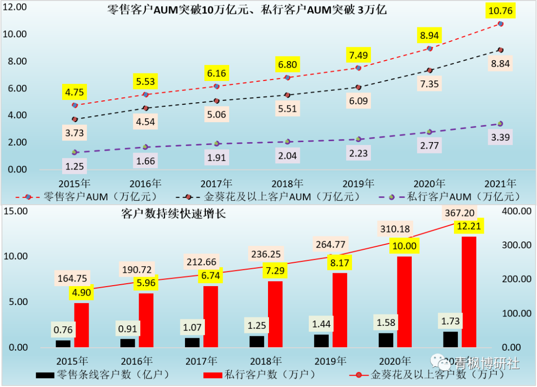 綜上,招行零售客戶、金葵花及以上客戶、私行客戶AUM的2021年全年增量分別相當于3家中小銀行、2家中小銀行以及1家中小銀行的總資產規模。