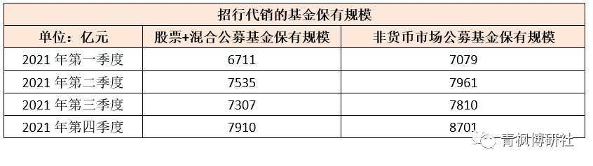 招行對代銷業務的重視還可以看另外一個數據,即公募基金的銷售保有規模,中基協所公布的基金代銷機構公募基金銷售保有規模數據顯示,招行于2021年四個季度代銷的非貨幣市場公募基金保有規模分別為7079億元、7961億元、7810億元和8701億元,其中股票+混合公募基金保有規模分別為6711億元、7535億元、7307億元和7910億元。
