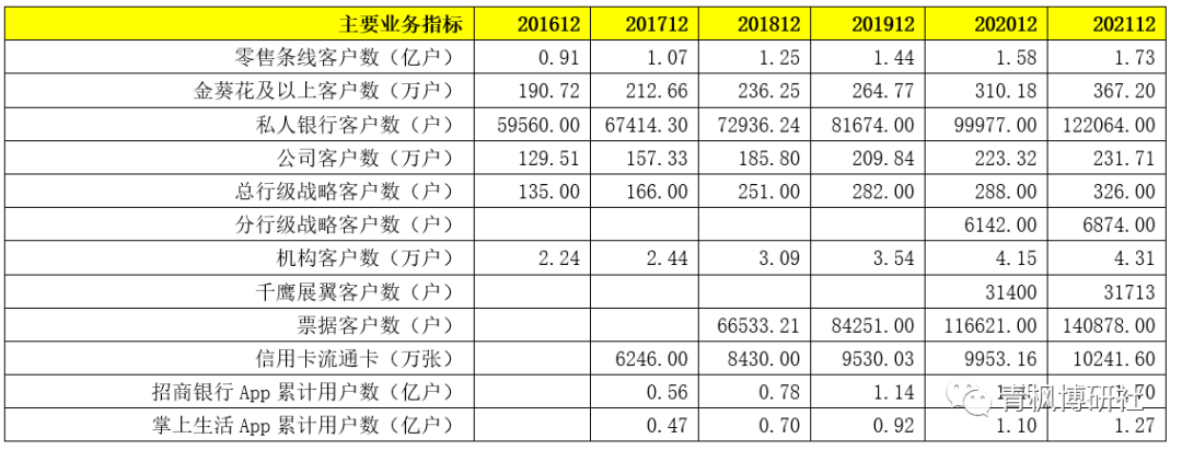 1、對于客戶數,招商銀行有非常詳細的分類,如在財報中基本會披露零售客戶數、APP活躍戶、借記卡和信用卡流通量、財富管理(含金葵花及以上和私行)客戶數、企業客戶數、機構合作客戶數、票據客戶數、兩大App累計用戶數等信息,并由此衍生出對應的AUM、MAU理財銷售額等指標。