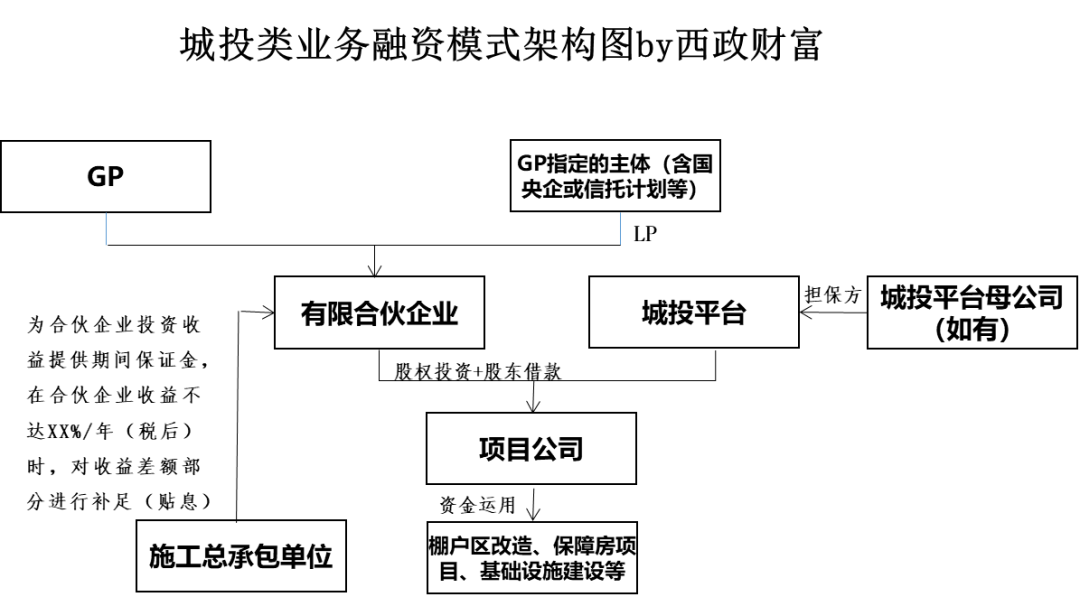 3. 增信擔保措施:施工總包單位對合伙企業期間收益提供期間保證金,并對合伙企業期間收益差額部分提供擔保(貼息),城投平臺的母公司提供擔保,項目公司章證照共管。