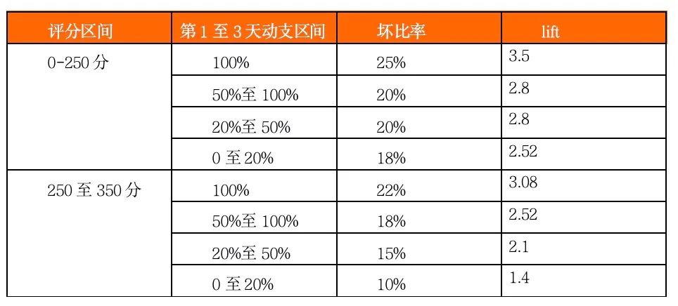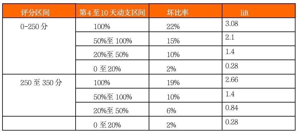 我們把未動(dòng)支、未逾期客戶定義為好客戶,去除有逾期記錄灰客戶,通過轉(zhuǎn)移矩陣(滾動(dòng)率)定義逾期N天以上為壞客戶。建立評(píng)分卡模型后,驗(yàn)證好灰壞的排序性,同時(shí)針對(duì)建模和驗(yàn)證客戶我們做動(dòng)支分析。我們做貸中動(dòng)支策略,首先是對(duì)動(dòng)支評(píng)分、動(dòng)支率、動(dòng)支天數(shù)的觀察定策略。舉例: