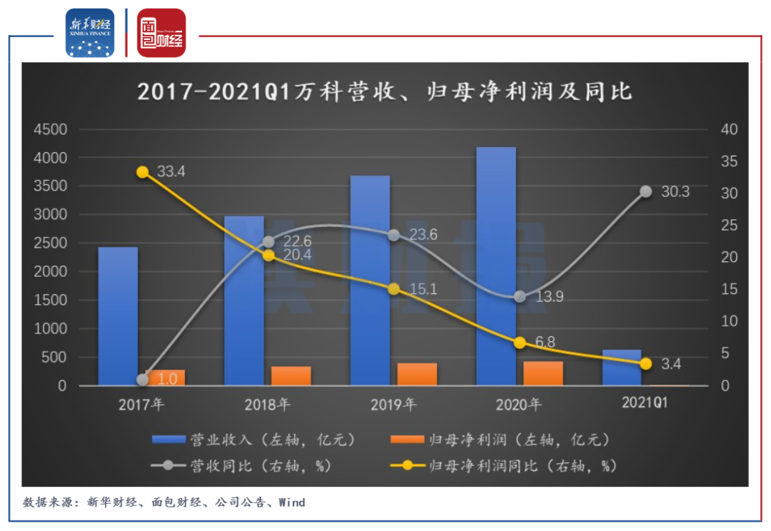 4月23日,萬科公布了2021年一季報,公司一季度實現營收622.6億元,同比增長30.3%;實現歸母凈利潤12.9億元,同比增長3.4%,凈利潤增速自2017年以來持續下滑。