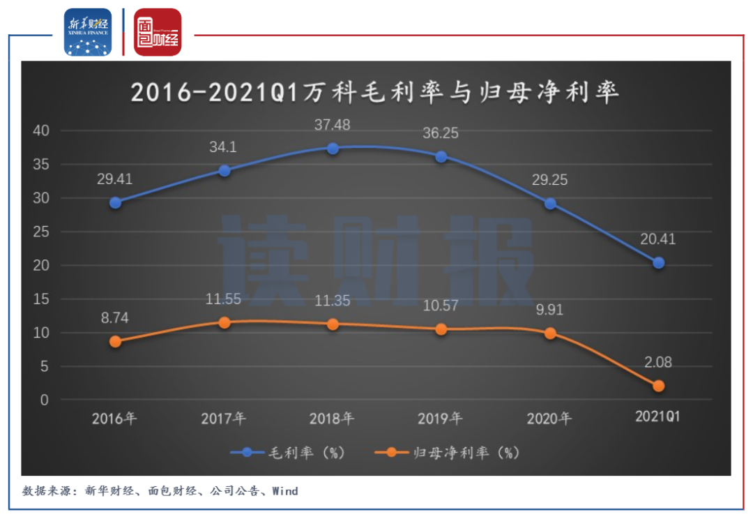 財報顯示,2021年一季度,公司稅后毛利率為16.1%,同比下降6.5個百分點,主要和近年來地價占房價比例提高有關;稅前毛利率為20.4%,同比下降9.5個百分點,創下1994年以來的最低值。毛利率的持續下探一定程度上也導致公司歸母凈利率的持續走低。