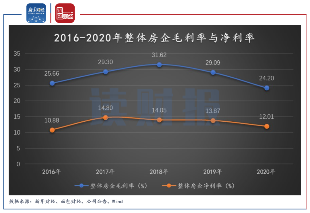 新華財經和面包財經研究員以滬、深、港三大股票交易所主要上市房企為樣本,統計了市值排名前三十的企業(以下統稱為“整體房企”)。從統計結果看,整體房企報表毛利率從2018年以來逐步下滑:2020年整體房企毛利率為24.2%,較2018年高點下滑7.4個百分點;凈利率為12%,較2018年下滑2.05個百分點,行業整體利潤率中樞下行。