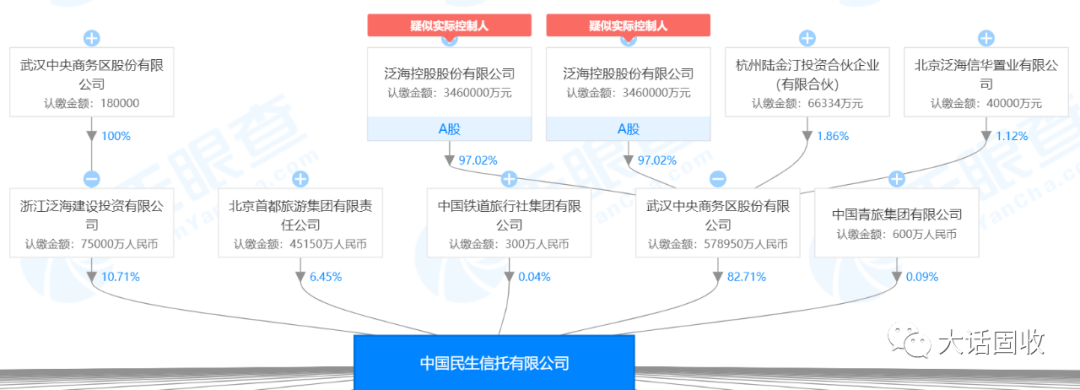 2016年,民生信托59.65%股權全部轉讓給武漢中央商務區建設投資股份有限公司,實控人仍然為泛??毓?。注冊增本也增加至70億元。
