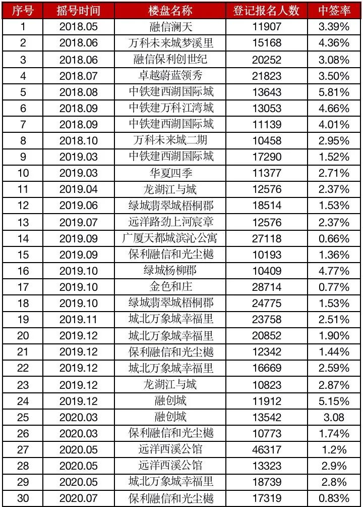 萬科天空之城、德信大家運河云莊、萬科前宸、遠洋西溪公館等6個紅盤項目加推,中簽率迅速走高。具體來看,6個項目中只有萬科天空之城、陽光城興耀花漾里兩個項目中簽率較低,但仍維持在10%左右,其余4個項目中簽率均在20%以上,最高的達到了67.42%。從登記戶數來看,基本在5000戶以下。