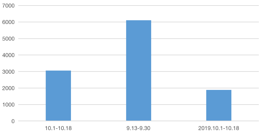經歷短暫降溫之后,10月5日,二手房成交套數迅速反彈至111套,至10月9日,成交套數已恢復282套相對高位。從10月1日至10月18日數據來看,二手住宅總成交套數達到3059套,環比(9月13-30日)減少99%,成交明顯縮量,但相較于2019年同期仍增長62%。