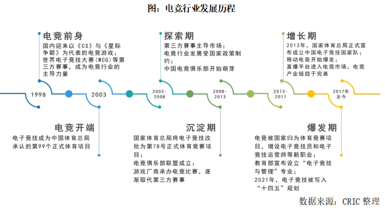 1998年,《CS》、《星際爭霸》等為代表的電競游戲風靡全國,我國初露電競萌芽。2003年,中國體育總局承認電子競技為我國正式開展的第99個運動項目,標志著國內電競的開端。從2003年到2017年期間,電競行業經歷了探索期、沉淀期、增長期,逐步從國家政策制約轉變為國家支持,產業鏈趨于完善;2017年,電競正式被國家歸為體育競賽項目,并增設電競相關專業與職業;2021年,電競入亞、《英雄聯盟》總決賽奪冠,電子競技產業的社會影響持續擴大,電競被寫入“十四五”規劃,走向標準化,迎來快速增長時期。