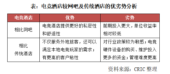 對于消費者而言,電競酒店與傳統網吧相比提供了更好的私密性和舒適性。而與傳統酒店相比,電競酒店不僅能給外來旅客提供住宿和服務,還能吸引當地的電競玩家在更好的環境里聚集,相對來說客戶粘性更高。但電競酒店從根本上來說還是以酒店模式運營,其重資產模式并未改變,電競硬件設備的購買、維護及管理需要投入更多的資金,不僅考驗房企長期的酒店管理及運營能力,也更考驗電競酒店的品牌打造和造勢宣傳。