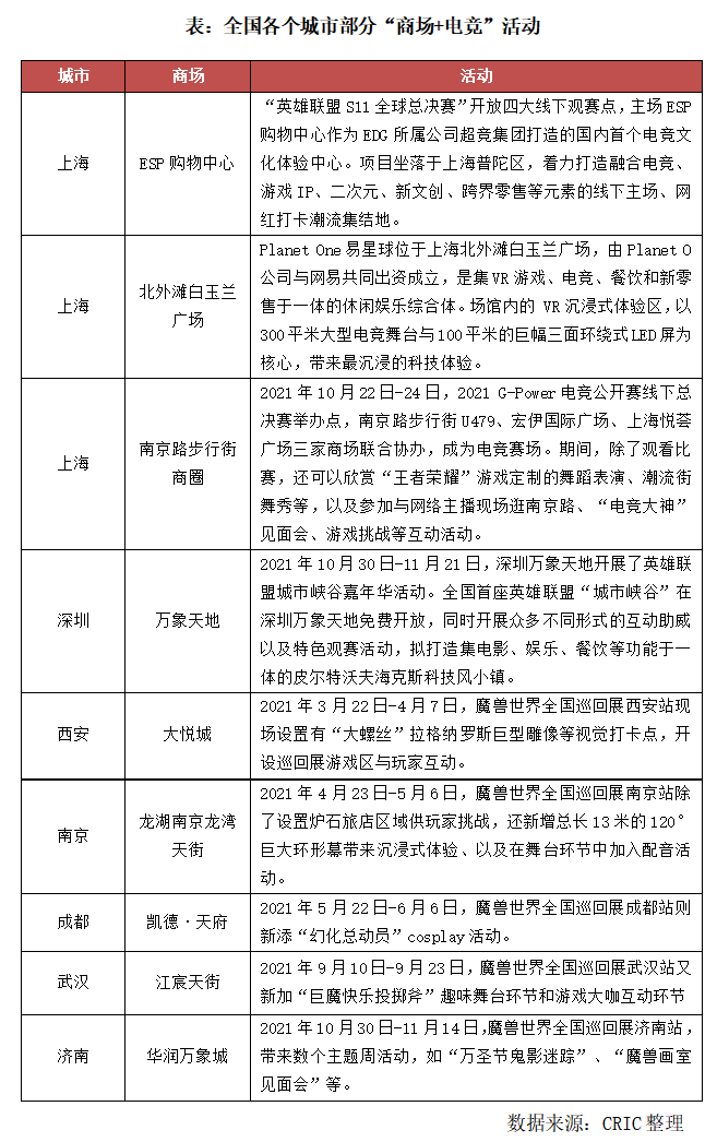 2021年,上海開設了第一家以電競為主題的購物中心—ESP購物中心,結合電競IP該中心引進全國首家王者榮耀職業聯賽5000平米專業賽館,預計每年舉辦超過350場比賽,全年線上曝光人次超200億。此外,區別于傳統的快閃模式,ESP購物中心不僅僅是在特定時期內與商場合作形成短期流量,而是融合了虛擬游戲、餐飲、聯名零售等一系列潮玩,精準對標不同客群的需求。