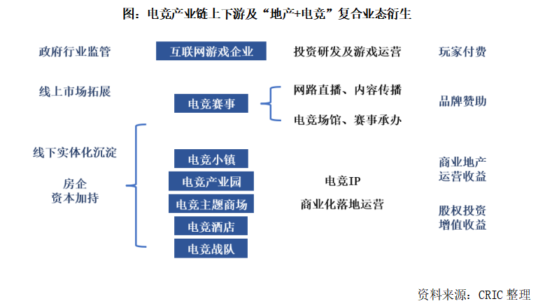 一方面,目前電子競技產業存在線上線下結合的需求,由線上擴張市場到線下實體化沉淀。電競玩家不僅愿意響應線上活動,也熱衷于參與線下活動。房企通過投資建設電子競技賽事場館,或勾地打造集成式電競小鎮、電競產業園。可以將線上電競流量引流至線下,在提升觀賽體驗和影響力同時,通過電競場館配套與承辦電競賽事活動,促進消費帶動泛文娛產業轉型升級,培育經濟紅利。