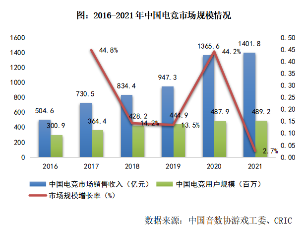 2016-2021年間,中國電競行業迅速發展,市場規模平均復合增長率達22.7%;截至2021年年末,中國電競行業銷售規模達1401.8億元。其中,2020年因疫情居家隔離政策,增加了電競游戲時間,電競用戶同比增長9.6%至約4.88億人,市場銷售收入同比增長44.2%;2021年受疫情持續反復影響,電競重要線下賽事減少,線上模式商業變現受阻,同時受制于未成年人網絡游戲防沉迷等相關政策要求,中國電競規模增速放緩,銷售收入同比增長率僅2.7%。
