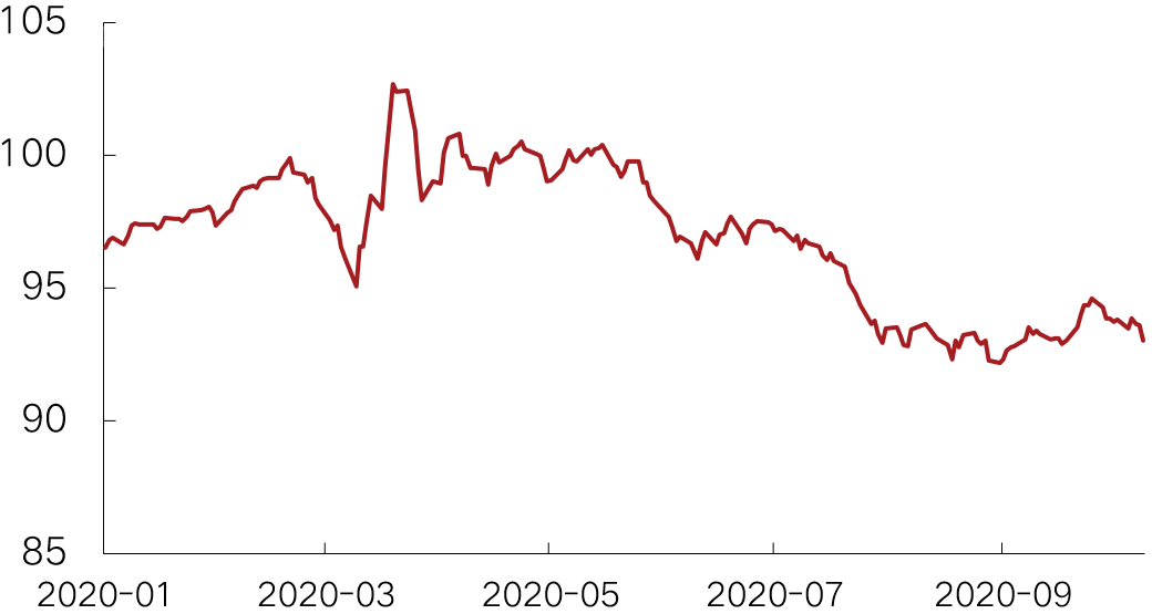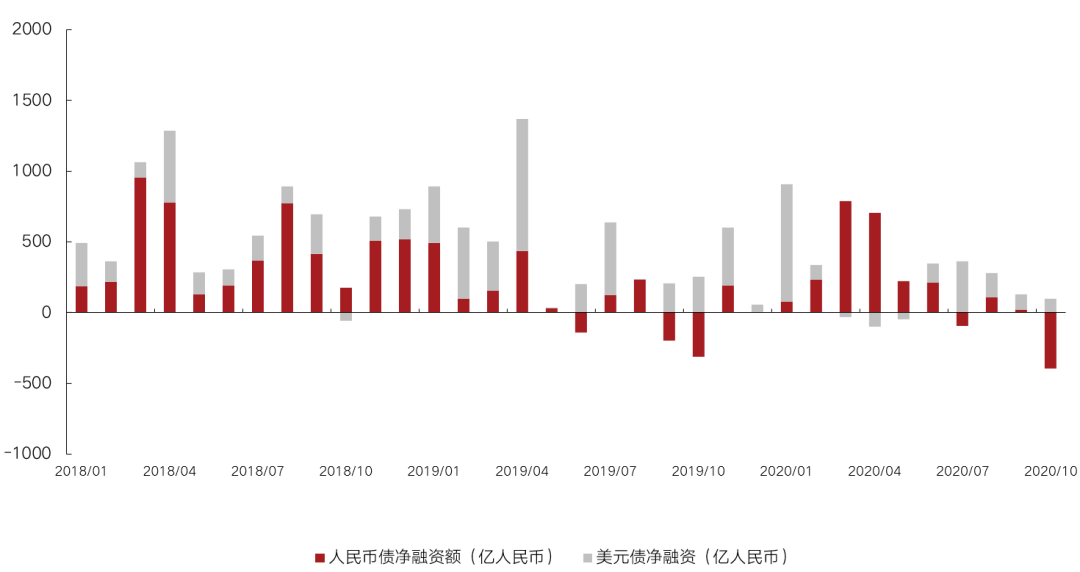 數據顯示,2020年前10月,人民幣債累計同比13.4%、美元債累計同比-24.4%,結合未來3個月到期人民幣債3315.0億人民幣(2019年11月-2020年1月在1693.6億人民幣)、美元債180.7億美元(2019年11月-2020年1月在107.5億美元),不考慮債務轉嫁,我們預計今年人民幣債累計發行同比在19.0%~32.6%、美元債累計同比在-22.6% ~ -15.0%。