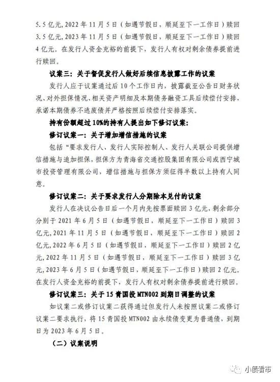 值得注意的是,修改議案中提到在資金充裕前提下,發(fā)行人有權(quán)對剩余債券提前進(jìn)行贖回。如果發(fā)行人未執(zhí)行分期付息,將“15青國投MTN002”由永續(xù)債變更為普通債,到期日為2023年6月5日。