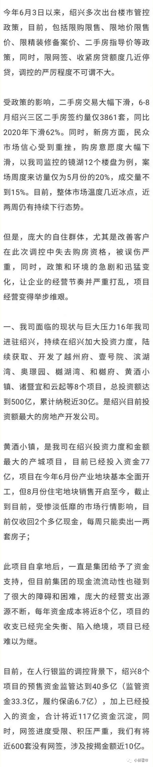 信中稱,因限購限售、房貸額度收緊等調控政策,融創中國(01918.HK)在浙江紹興的項目銷售慘淡,網簽進度和按揭回款受限,公司懇請紹興市政府給予政策上的專項支持。