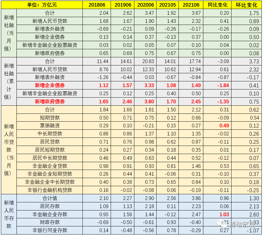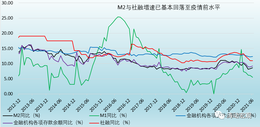 近年來(lái)的政策均明確“保持M2、社融增速與名義經(jīng)濟(jì)增速基本一致”,并以此為基礎(chǔ)保持宏觀杠桿率水平基本穩(wěn)定。雖然今年6月的M2與社融大超預(yù)期(票據(jù)融資和企業(yè)中長(zhǎng)期貸款同比明顯多增、房貸少增、企業(yè)存款同比亦大幅多增),但增速基本上已回歸到疫情前的水平,較疫情期間下降明顯(今年前6個(gè)月企業(yè)債券和政府債券同比分別少增1.84萬(wàn)億和1.35萬(wàn)億、合計(jì)少增3.19萬(wàn)億)。例如,2021年6月,M2、社融存量、貸款余額與存款余額同比增速分別降至8.60%、11%、12.30%和9.20%,已經(jīng)和疫情前的平均水平相當(dāng)。