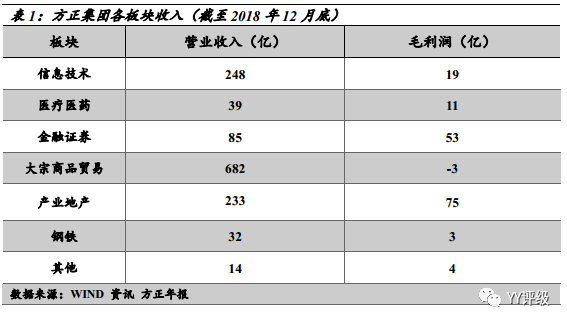 方正集團在產業布局端亦是一“絕“,行業“綜合”以至于眼花繚亂,具體來看,主要有信息技術板塊、醫藥醫療業務板塊、鋼鐵業務板塊、大宗貿易業務板塊(做大營收的利器,內里一地雞毛)、地產板塊、教育業務板塊、金融證券板(核心中的核心)。