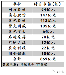 再看清華一脈,公司截至2019年3月底,公司直接或間接持有的上市公司市值總額為869億元,遠高于同期長期股權投資賬面價值237億元,具體分項如下表: