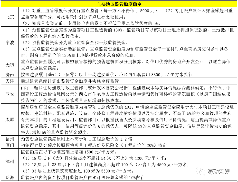例如,北京、濟南、漳州等地區按照每平方米的建造成本來設定,寧波、福州、廈門等地區則按照工程造價款的一定倍數來設定(如寧波為1.30倍、福州和廈門為1.20倍等),太原則按照監管項目總預售款的40%來設定等等。