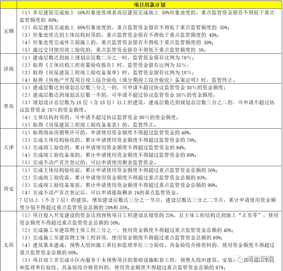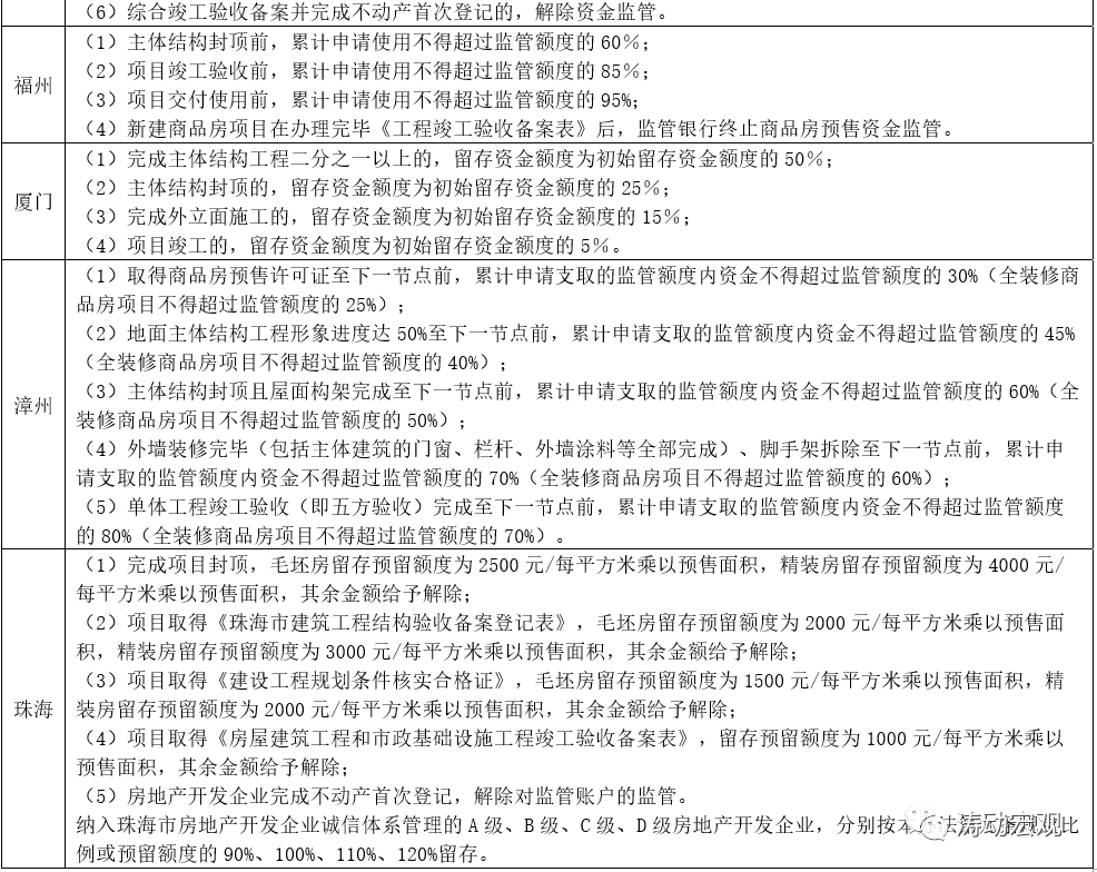 3、預售資金監管的期限一般自核發商品房銷售許可證開始,至辦理不動產首次登記后止。同時,在預售監管資金的使用上,一般會按照工程進度的節點差異化監管,主要的工程節點有地上“正負零”、地上1/3、地上1/2、地上2/3、主體封頂、二次結構完成以及取得《建設工程竣工驗收報告》、《建設工程外裝修核驗記錄》、《建設工程竣工驗收備案證》、完成不動產首次登記等等。