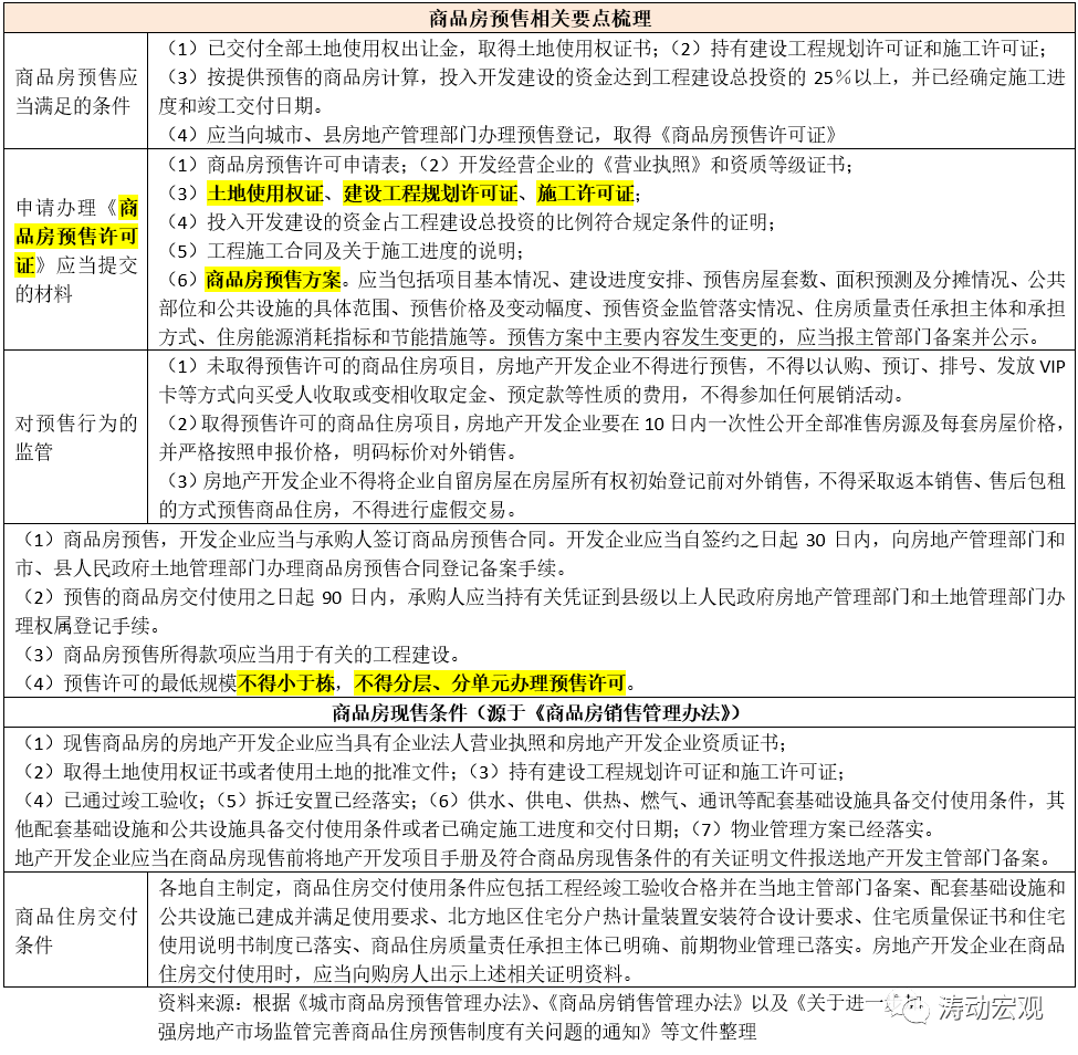 與商品房預售有關的政策文件主要包括《城市房地產管理法》、《城市商品房預售管理辦法》、《城市房地產開發經營管理條例》和《商品房銷售管理辦法》以及《關于進一步加強房地產市場監管完善商品住房預售制度有關問題的通知》。2010年4月13日,住建部發布的《關于進一步加強房地產市場監管完善商品住房預售制度有關問題的通知》(建房(2010)53號)給出了整體政策框架。具體如下: