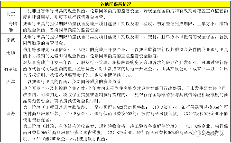 1、目前已有北京、上海臨港、寧波、無錫、石家莊、天津、珠海等地區明確可以通過保函來替換對應監管額度,這里的保函通常指非監管銀行或控股股東出具的保函。例如,北京、天津等。明確可以憑非監管銀行出具的現金保函免除同等額度的監管資金。