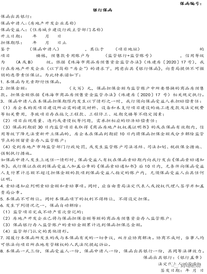 2、珠海在保函方面的規定比較詳細。具體看,珠海明確地產開發企業及其控股企業連續3個年度內未受到住建部門行政處罰,且未發生監管賬戶司法凍結、司法扣劃、稅收保全措施或強制執行措施的,可憑銀行保函等額替換與其誠信等級相應額度的商品房預售資金。商品房預售資金撥付時,