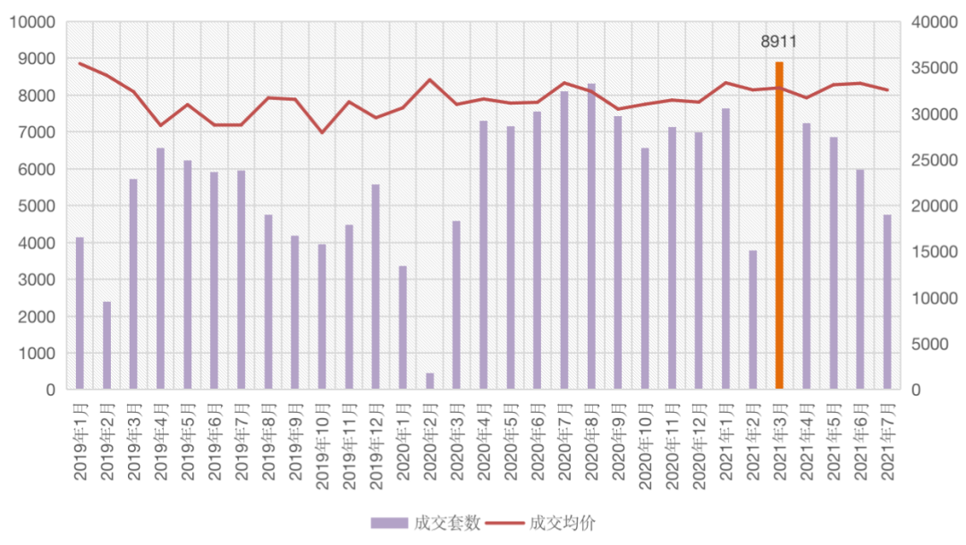 圖:2019年1月-2021年7月杭州二手住宅成交量價走勢(單位:套,元/平方米)